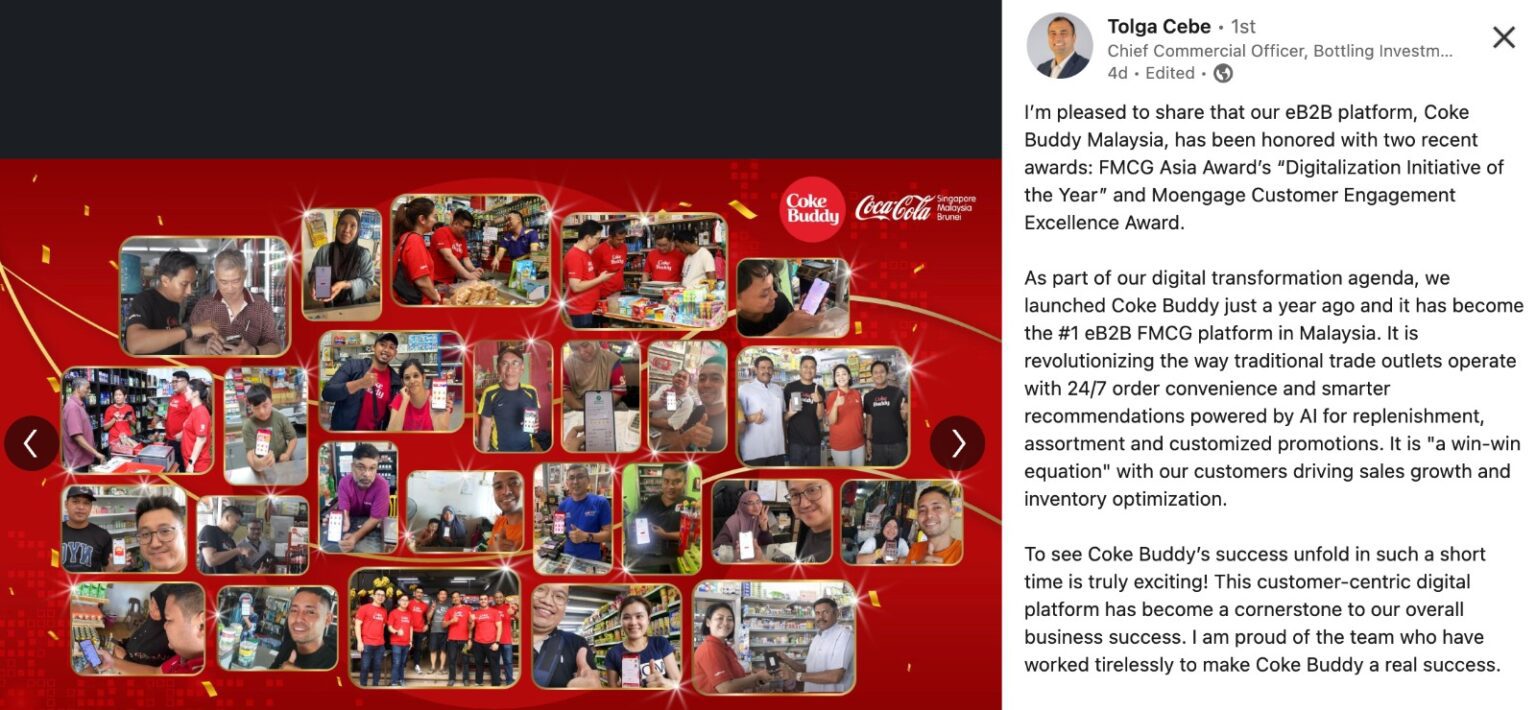 Weโre super excited to celebrate the success of Coca-Cola Refreshments Malaysia, which has been awarded the ๐๐ถ๐ด๐ถ๐๐ฎ๐น๐ถ๐๐ฎ๐๐ถ๐ผ๐ป ๐๐ป๐ถ๐๐ถ๐ฎ๐๐ถ๐๐ฒ ๐ผ๐ณ ๐๐ต๐ฒ ๐ฌ๐ฒ๐ฎ๐ฟ โ ๐ ๐ฎ๐น๐ฎ๐๐๐ถ๐ฎ at the prestigious FMCG Asia Awards 2024 for their eB2B platform, #CokeBuddy!