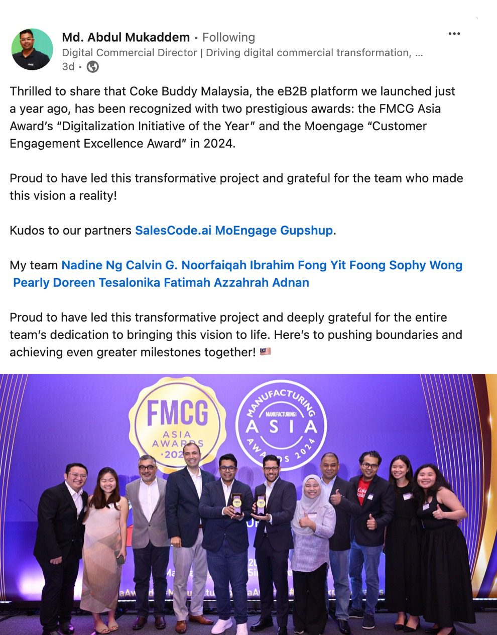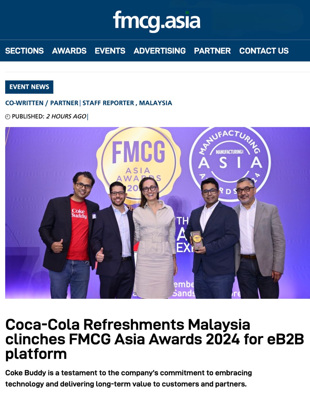 Powered by SalesCodeโs AI-Powered eB2B Platform, Coca-Cola Malaysia wins ๐๐ถ๐ด๐ถ๐๐ฎ๐น๐ถ๐๐ฎ๐๐ถ๐ผ๐ป ๐๐ป๐ถ๐๐ถ๐ฎ๐๐ถ๐๐ฒ ๐ผ๐ณ ๐๐ต๐ฒ ๐ฌ๐ฒ๐ฎ๐ฟ โ ๐ ๐ฎ๐น๐ฎ๐๐๐ถ๐ฎ at the prestigious FMCG Asia Awards 2024