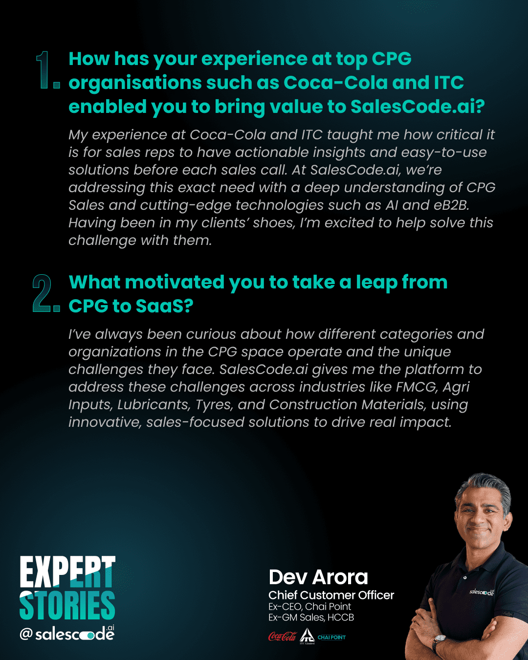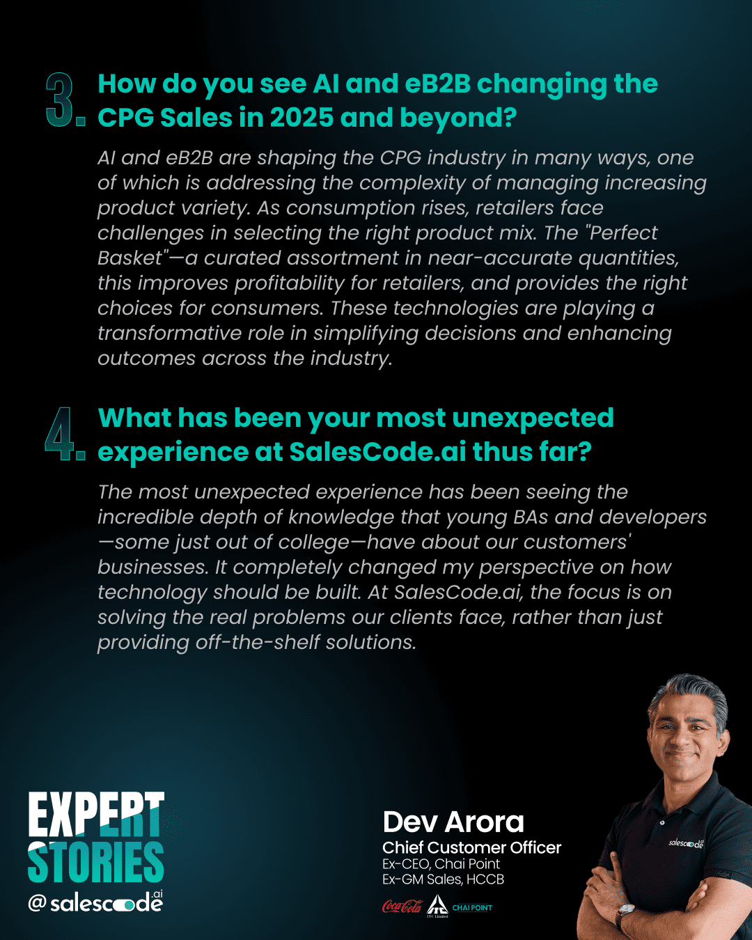 Dev Arora joined us last year to further strengthen our team. He brings extensive experience in FMCG from his time at Coca-Cola and ITC. In this last assignment before joining SalesCode.ai, Dev served as the CEO of the CPG Business at Chai Point.