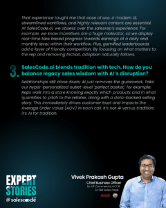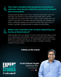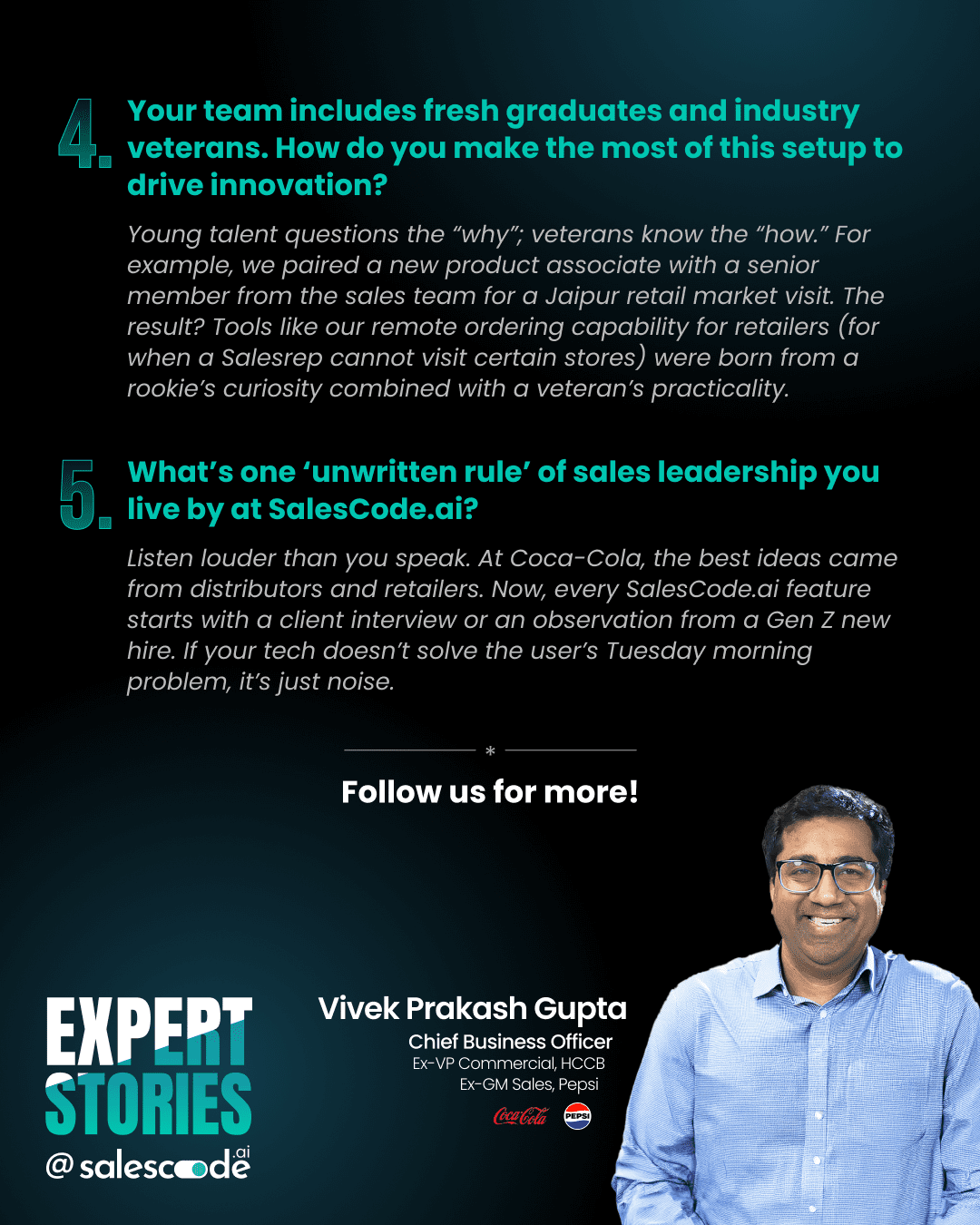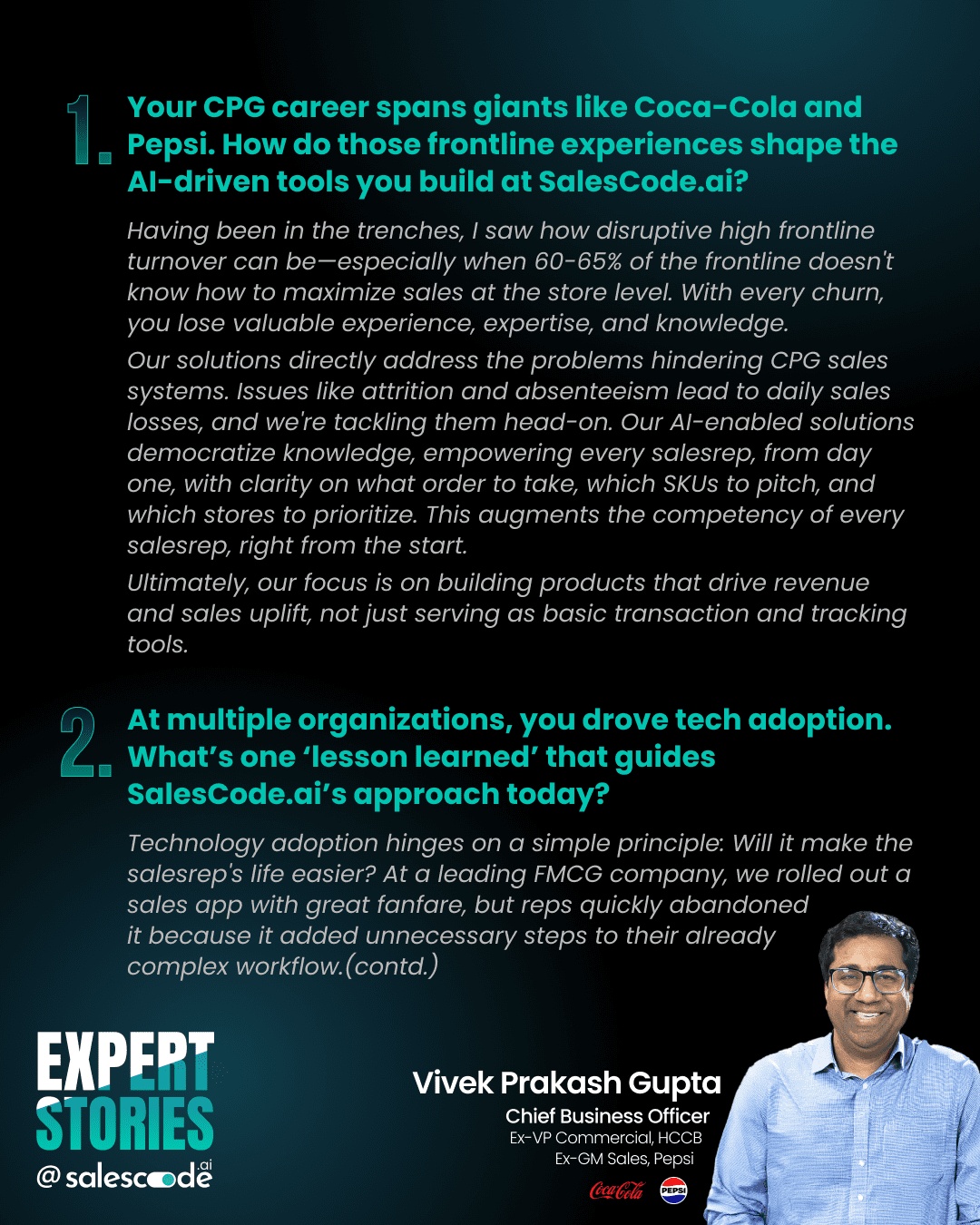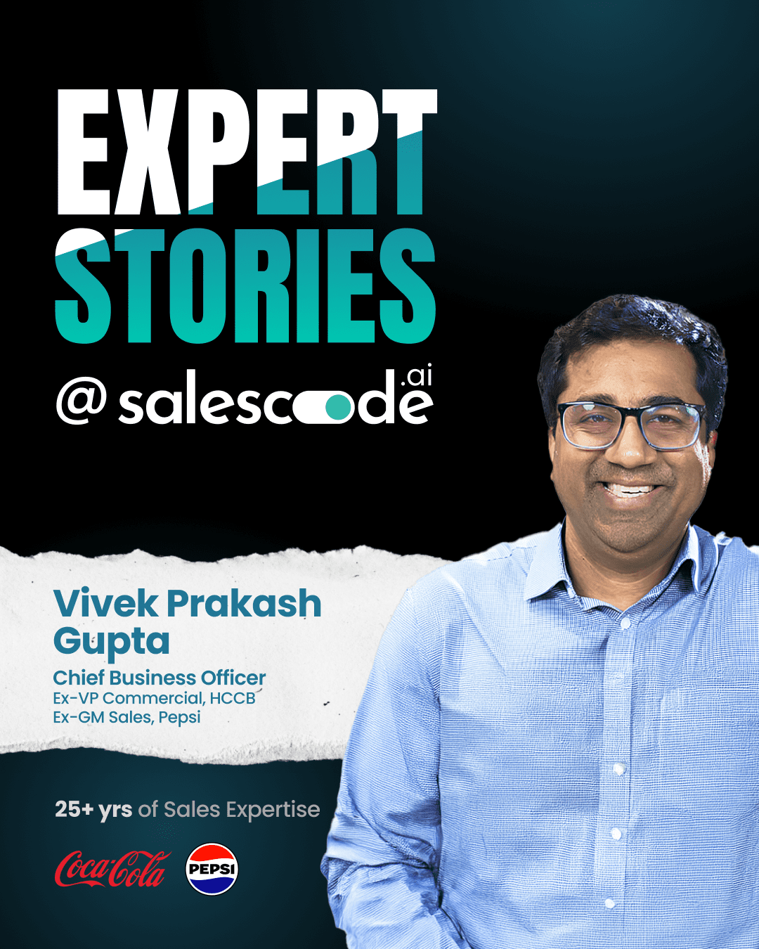 Vivek Prakash Gupta is a true CPG veteran, with 𝟮𝟱+ 𝘆𝗲𝗮𝗿𝘀 𝗼𝗳 𝗲𝘅𝗽𝗲𝗿𝗶𝗲𝗻𝗰𝗲 in leadership roles at companies such as 𝗖𝗼𝗰𝗮-𝗖𝗼𝗹𝗮, 𝗣𝗲𝗽𝘀𝗶, 𝗠𝗼𝗻𝗱𝗲𝗹𝗲𝘇, 𝗘𝗺𝗮𝗺𝗶 𝗮𝗻𝗱 𝗗𝗙𝗠 𝗙𝗼𝗼𝗱𝘀. He joined SalesCode.ai as the Chief Business Officer about a year ago, and things have not been the same since.