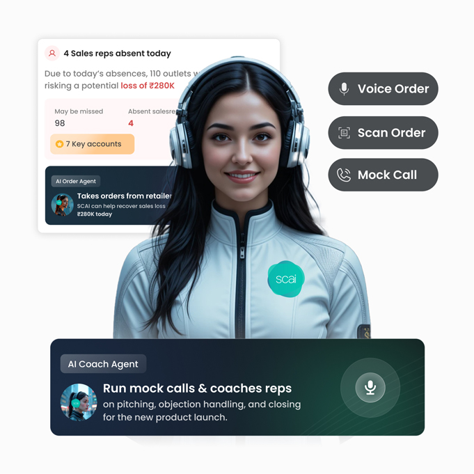 SCAI is the world’s first AI sales Agent that can talk like a human, make outbound sales calls, receive inbound sales calls, take orders from retailers, enrol them in a promotion, do mock calls with sales reps on new products and promotions, onboard and coach new joiners, and give 24×7 expert assistance, better than humanly possible.
